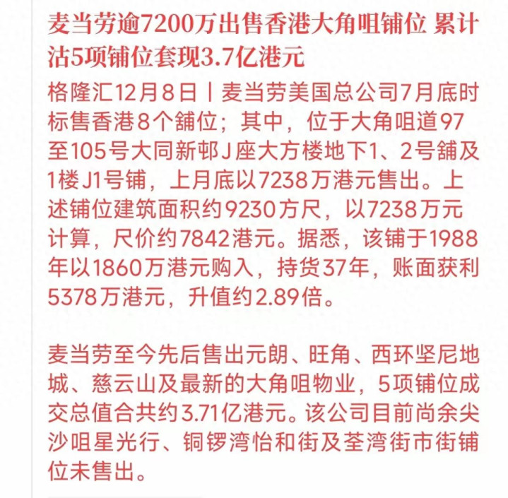 家人们,最近商业圈一则消息引发了广泛关注,麦当劳在香港的一处铺位,持有37年后以7238万港元成功卖出,而当初买入时仅仅花了1860万港元,这一来一去老虎配资,账面直接赚了5378万港元,资产升值近3倍,这操作简直让人忍不住直呼“太牛了”!