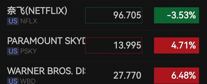 受此消息影响,截至发稿,华纳兄弟探索股价上涨6.48%,派拉蒙天舞股价上涨4.71%,奈飞跌3.53%。